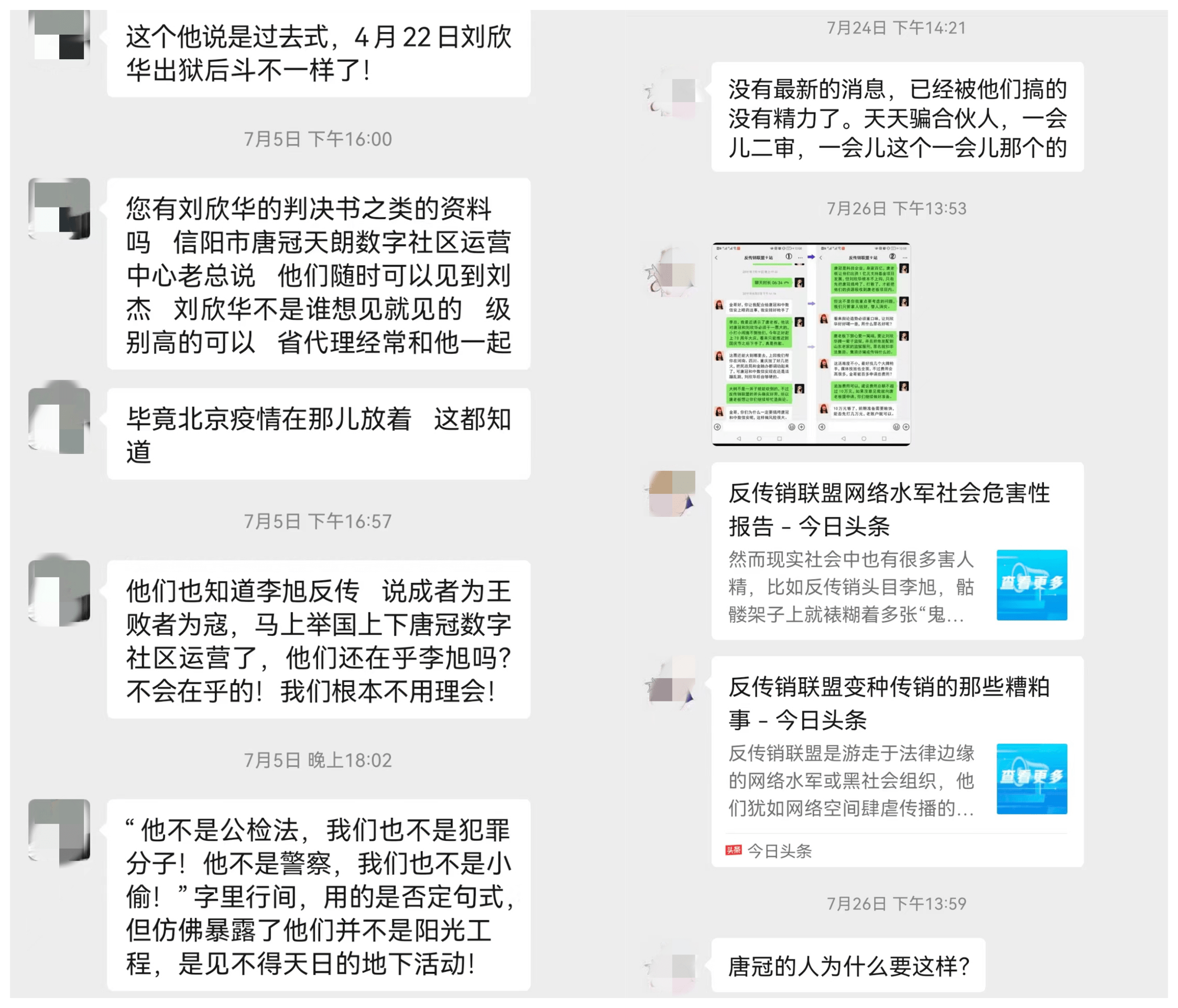 通过以上的聊天记录可以看出,参与唐冠数字社区的投资人很多都是资金盘等网络传销和异地传销的难民,很多人还指望通过“唐冠数字社区”咸鱼翻身,殊不知又被收割了一把,真的是雪上加霜。这些几年前的投资人,辛辛苦苦挣来的血汗钱无疑都打了水漂。