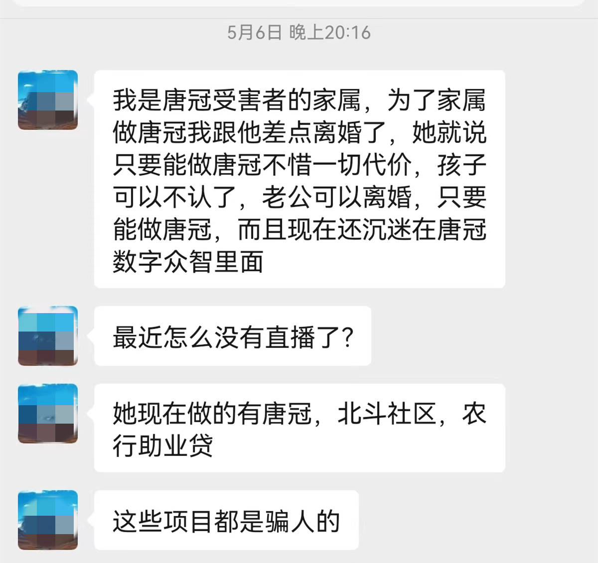 唐冠数字社区的疯狂还在危害一个一个原来温馨和谐的家庭,反对的家属差点付出了离婚的代价:我跟她差点离婚了,她说只要能做唐冠不惜一切代价,孩子可以不认了,老公可以离婚,现在还沉迷在唐冠数字众智里面。