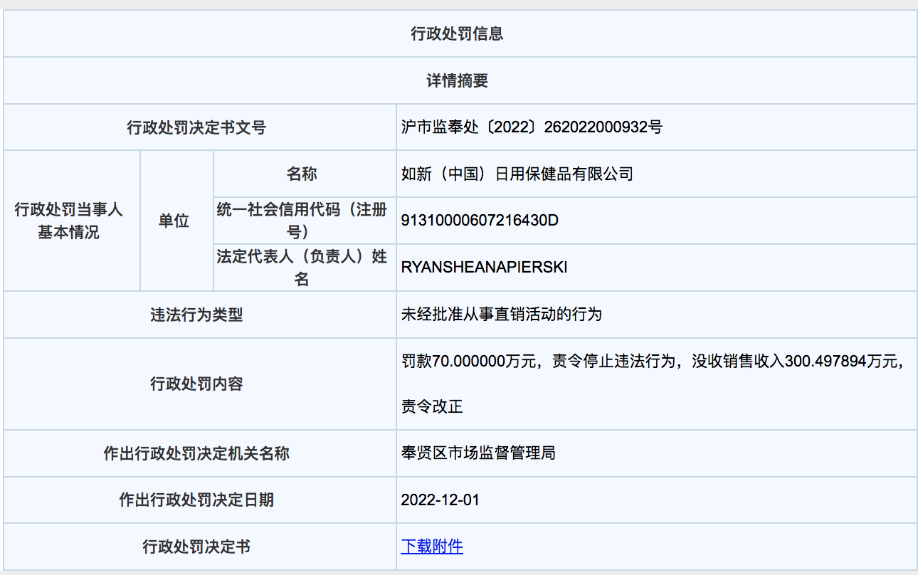 中新经纬12月13日电 查询上海市市场监管局官网发现,12月1日,如新(中国)日用保健品有限公司因违反直销管理条例以及反不正当竞争法,被罚款70万元,并没收销售收入约300万元。