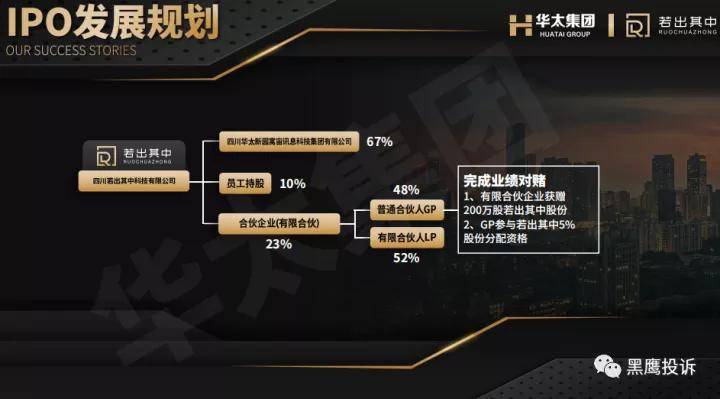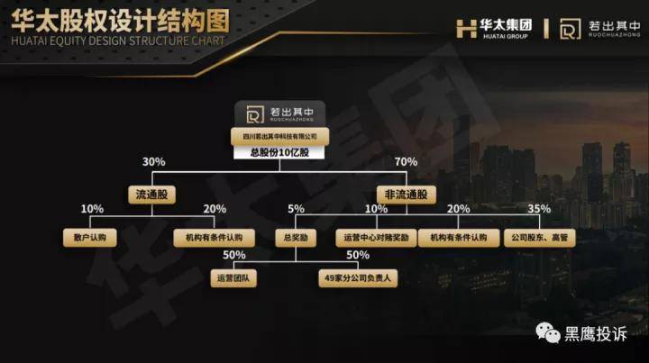 2022年10月21日在成都隆重召开了2022年华太集团战略发布会,也在当天华太集团的第二支原始股也开始对外兜售,此次兜售原始股的主体为四川若出其中科技有限公司(以下简称若出其中),总共发行的股份是十个亿。这其中分为30%的流通股与70%的非流通股。流通股中10%为散户认购,20%为机构有条件认购。在70%的非流通股中, 10%为运营中心对赌奖励、20%为机构有条件认购,以及35%为公司股东、高管持有。此外,还有5%为总奖励,分配给运营团队与49家分公司负责人,两边均获得当中的50%。
