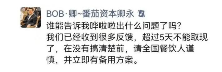 据自媒体“餐饮资本论”消息,窄门集团创始人卿永近日在朋友圈提问,哗啦啦出现了什么问题。也有某酒馆品牌创始人称,哗啦啦出现提现问题已有一段时间,催款后也效果不佳,许久才能提出一笔资金。公司推迟提款的理由包括北京疫情、银行问题等。公司目前对公提款可以接受,对私提款非常拖沓。