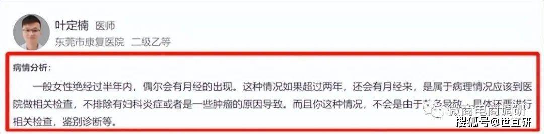 而东莞市康复医院叶定楠医师则回复称:一般女性绝经过半年内,偶尔会有月经的出现,这种情况如果查过两年,还会有月经来,是属于病理情况应该到医院做相关检查,不排除有妇科炎症或者是一些肿瘤的原因所致。