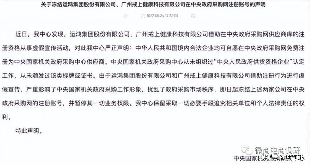 记者在中央国家机关政府采购中心的官网上检索发现,2022年6月24号官网发布一则《关于冻结运鸿集团股份有限公司、广州戒上健康科技有限公司在中央政府采购网注册账号的声明》的公告,公告称,中华人民共和国境内合法企业均可自愿在中央政府采购网免费注册为中央国家机关政府采购中心供应商。