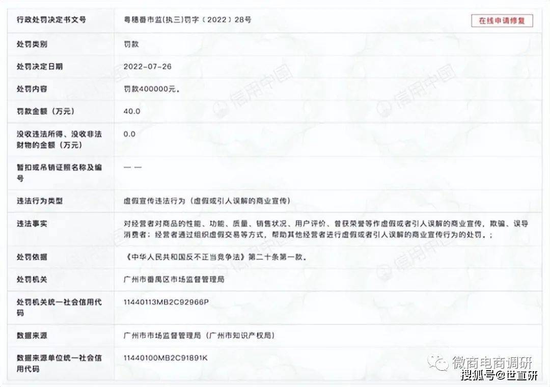 2022年7 月26日,广州市番禺区市场监督管理局对广州戒上健康科技有限公司行政处罚40万元人民币。违法类型是虚假宣传违法行为(虚假或引人误解的商业宣传)。违法事实是:对经营者对商品的性能、功能、质量、销售状况、用户评价、曾获荣誉等作虚假或者引人误解的商业宣传,欺骗、误导消费者;经营者通过组织虚假交易等方式,帮助其他经营者进行虚假或者引人误解的商业宣传行为的处罚。
