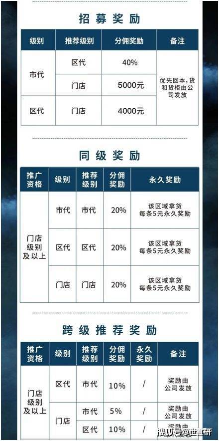 值得注意的是,例如成为该司区代级别20家门店招满以后,区代每招一个门店直接奖励4000元,如是市代级别每招一个奖励5000元。门店代理只能向区代拿货,区代只能向市代拿货。自身成为该司代理后,推荐人成为代理可享受不同的级别收益。共有招募奖励,同级奖励和跨级推荐奖励三个直接奖励。