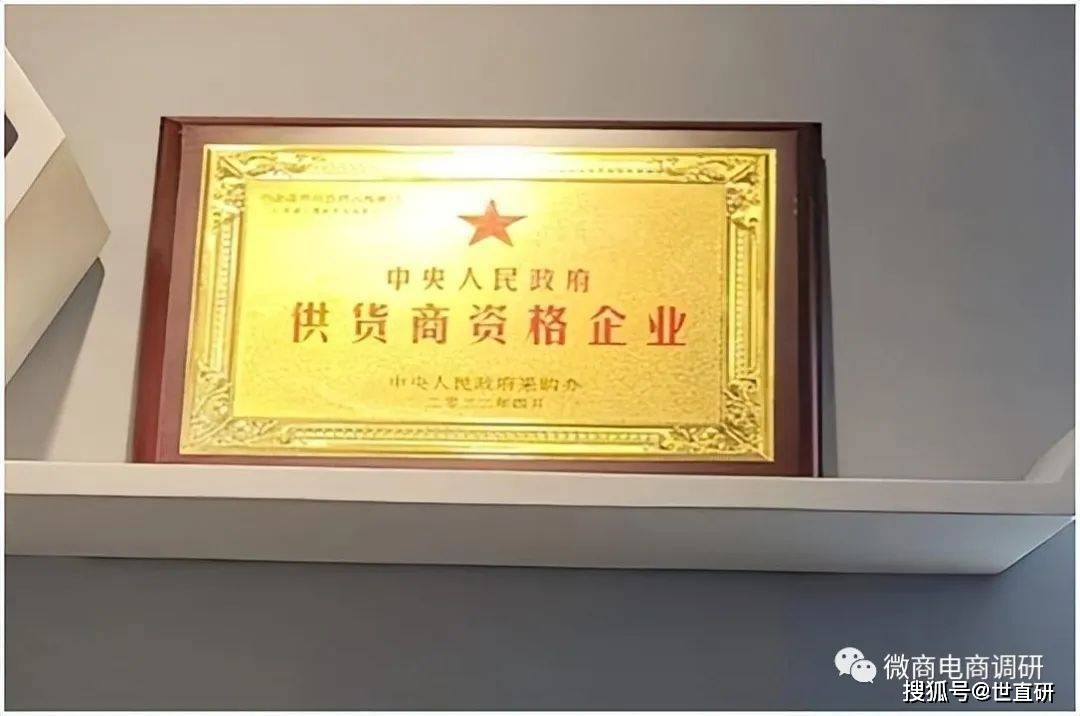10月9日,记者通过加盟商引荐,进入广州戒上科技有限公司所在地考察。在工作人介绍下发现,该司前台展示多张网络大V吴帝聪与公众知名人物的合影及多块标牌荣誉证书,其中有两块“中央人民政府供货商资格企业”的标牌格外引人注目。这两块标牌内容一模一样,颁发单位为“中央人民政府采购办”,日期为二零二二年四月,没有落款印章。