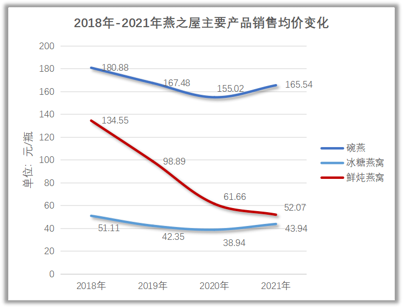 具体来看,燕之屋碗燕的均价已从2018年的180.88元/碗降到了2021年的165.54元/碗;冰糖燕窝价格从2018年的51.11元/瓶,降到了2021年43.94元/瓶;鲜炖燕窝价格降幅超六成,从2018年的134.55元/瓶,降到了2021年52.07元/瓶。