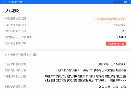 腾讯“灵鲲金融风险查询举报中心”显示“九极”被标记848次,主要标签为“拥有直销牌照”、“有一定实力”、“谨慎参与”,标记类型“有违规直销行为”。