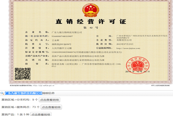 商务部公示信息显示,广东九极生物科技有限公司(以下简称“九极生物”)于2013年7月23日获批第42号直销经营许可证。直销区域分布于广州市、福建、浙江、江西、四川、吉林、云南、青岛、贵州等9个区域,直销服务网点共73个,直销培训员仅2人。