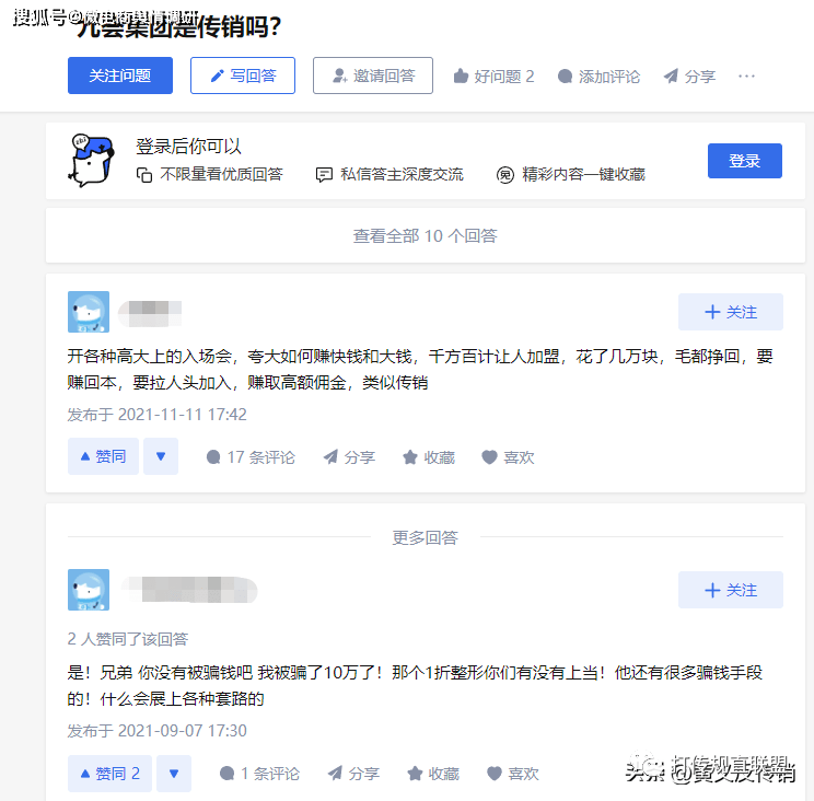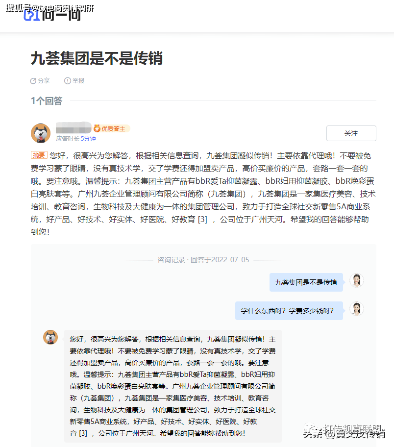 此外,本网在知乎、问一问等平台上注意到,有不少网友询问九荟集团是否涉嫌传销,不少知情网友回复称“疑似传销”,并表示九荟集团的利润来源主要是依靠发展代理,没有真技术,交了学费还得加盟卖产品,高价买廉价的产品,全是各种套路。还有网友称自己被九荟集团骗了10万元……
