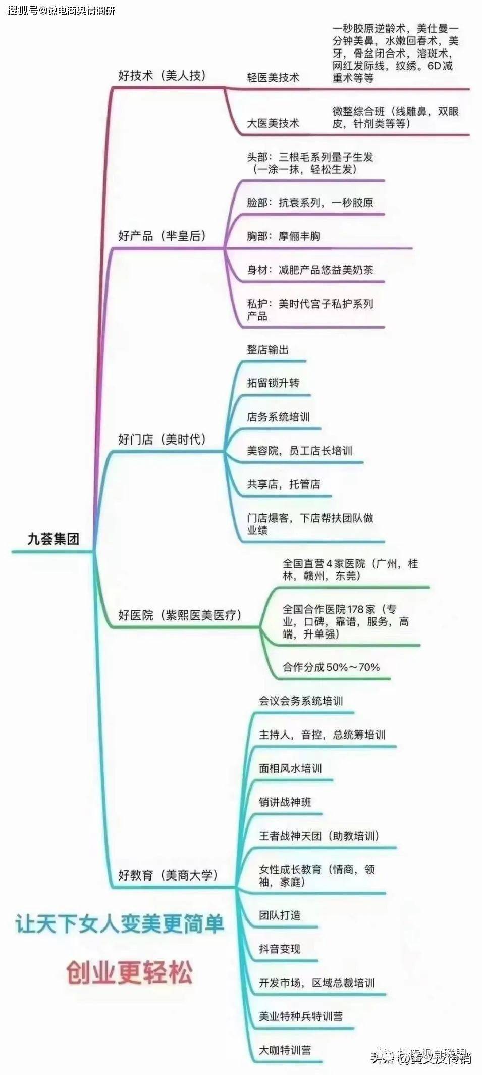 据九荟集团官网介绍称,九荟集团是一家专注于美业技术、产品研发、商学教育、品牌运营为一体的女性美商创业平台。依托教育为核心,打造全新的美业5A商业系统。所谓的5A商业系统为:好技术——美人技、好产品——芈皇后、好门店——美时代、好医院——紫熙医美医疗和好教育——美商大学。