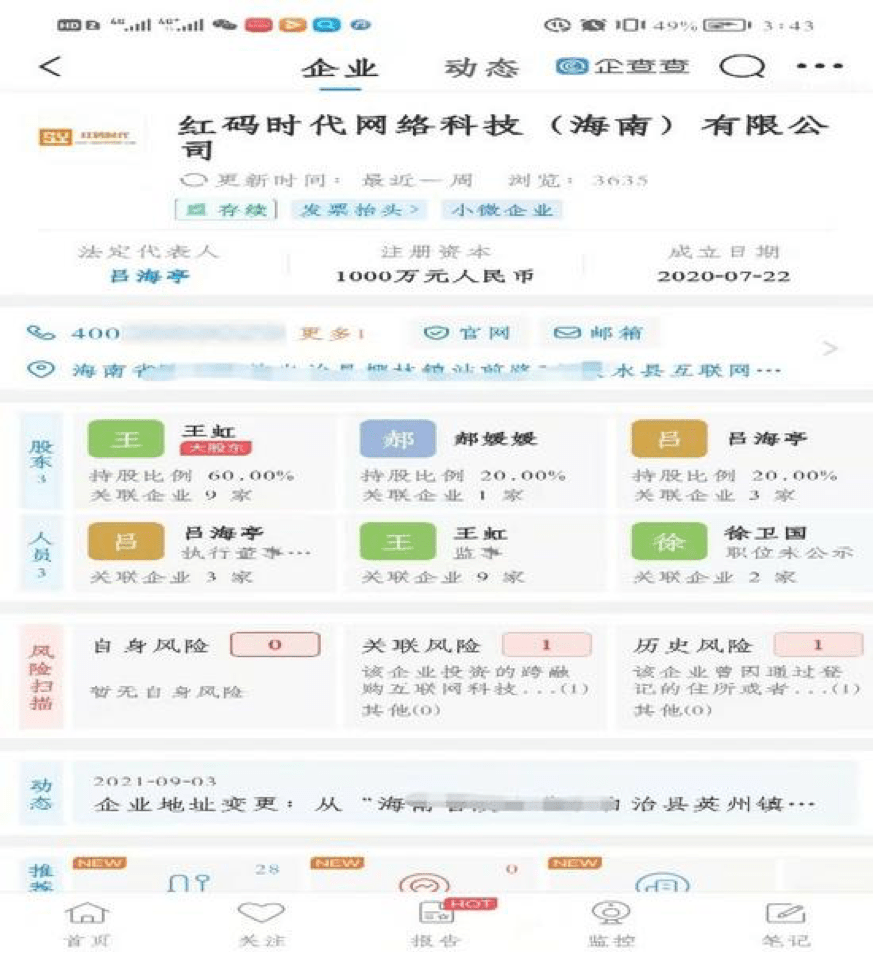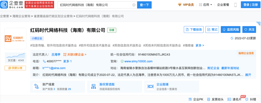 根据对SY商城进行调查与核实,显示SY商城属于“红码时代网络科技(海南)有限公司” 。成立于2020年7月22日,法定代表人吕海亭,股东为王虹持股比例60%,郝媛媛持股比例20%,吕海亭持股比例20%,注册资本1000万人民币(实缴资本10万元),实缴资本与注册资本之间数额严重不符。