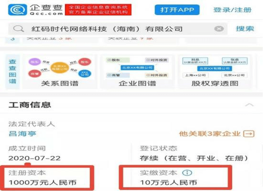 有限责任公司的注册资本为在公司登记机关登记的全体股东认缴的出资额。公司全体股东的首次出资额不得低于注册资本的百分之二十,也不得低于法定的注册资本最低限额。注册资金为1000万元,按照最低出资额20%,也得有200万元,红码时代(海南)公司明显不符合。