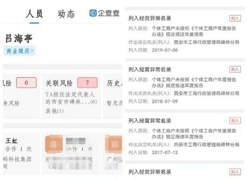 另外据我们调查,其两大股东都有“自身风险”或“关联风险”,吕海亭关联风险7处,王虹存在关联风险1处。