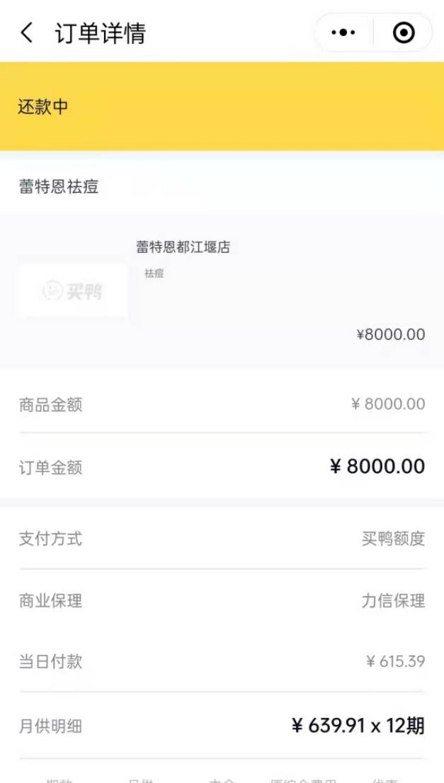 之后在询问深度护理的价格时,程先生得知整个流程下来需要8000元。程先生表示,自己拿不出这些钱,就想暂且作罢。这时蕾特恩工作人员告诉程先生,可以在他们店里做美容贷分期,这样还款无压力。最终在蕾特恩工作人员的轮番劝说下,程先生动了心。程先生说,蕾特恩工作人员拿着他的手机、身份证、银行卡,在一个名为“买鸭”平台上办理了总计8000元分12期偿还的贷款,贷款金额由买鸭平台直接打入都江堰蕾特恩祛痘门店的账户。