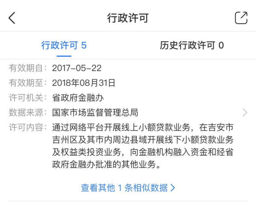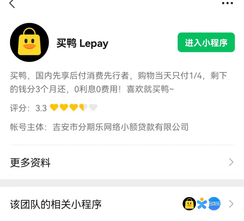 根据程先生提供的“买鸭”贷款平台小程序,记者查询到,买鸭平台帐号主体为江西省吉安市分期乐网络小额贷款有限公司。而天眼查数据显示,吉安市分期乐网络小额贷款有限公司大股东为深圳市分期乐网络小额贷款有限公司,实际控制人为曾担任腾讯财付通总监的肖文杰。不过记者在查询吉安市分期乐网络小额贷款有限公司行政许可时,发现该公司虽然取得了江西省金融办批准的开展线上小额贷款业务许可,不过经营范围只限于吉安市吉州区及市内周边县市,而其跨省在四川都江堰开展业务已经涉嫌违规。