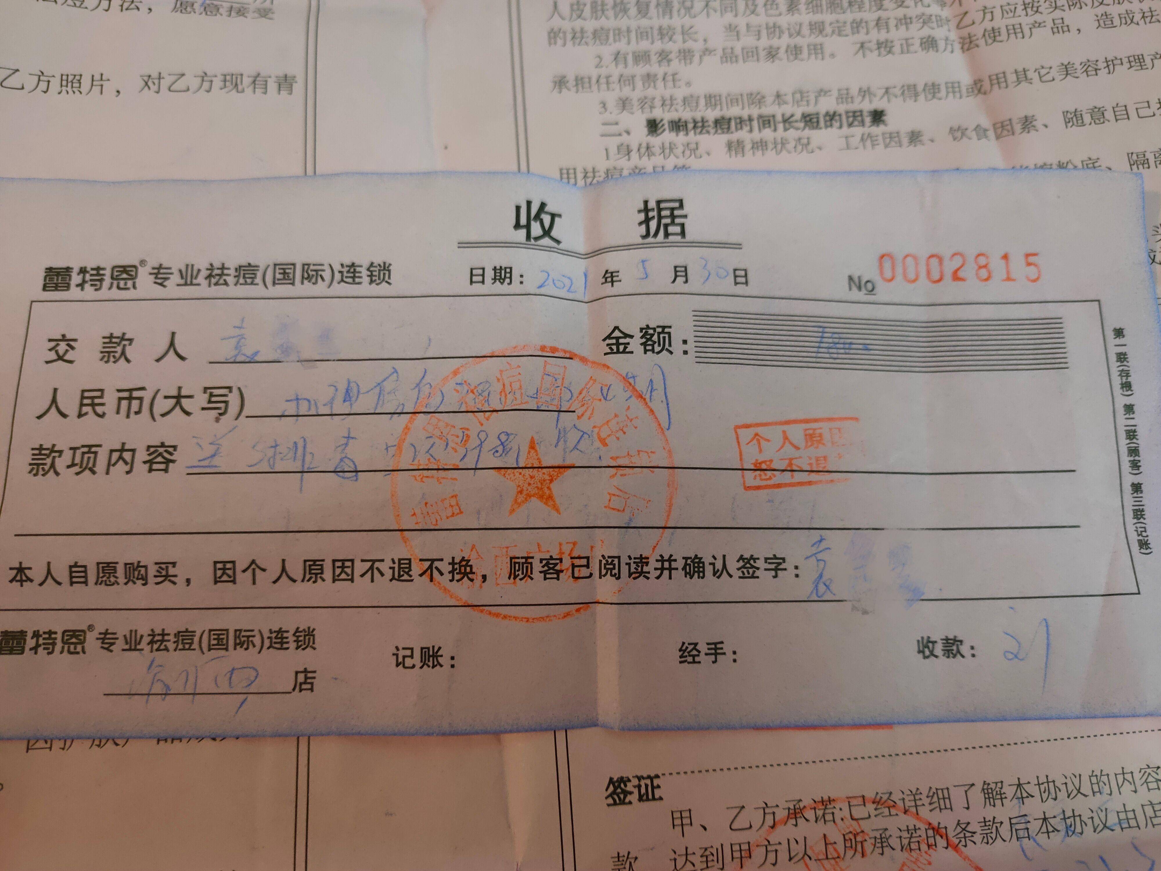 小袁是重庆某大学的大二学生,前段时间她在网上了解到蕾特恩祛痘连锁机构正在做活动,只要到店即可享受免费皮肤检测服务,于是抱着免费体验的心态,小袁5月30日如约来到重庆蕾特恩祛痘连锁永川店进行了皮肤检测,小袁说就是这次检测,让自己一步步落入了商家设好的陷阱之中。