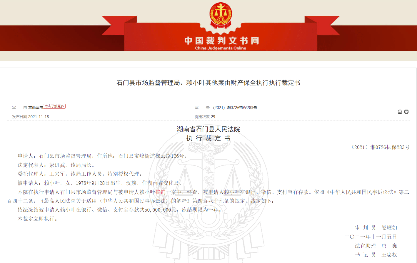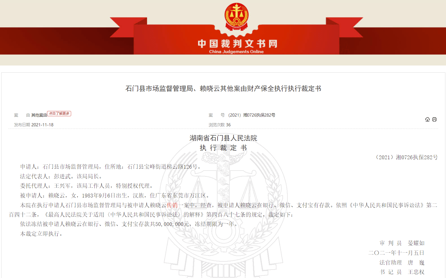 此外湖南省石门县人民法院发布的另外两则行政书分别为《石门县市场监督管理局、赖晓云其他案由财产保全执行执行裁定书》及《石门县市场监督管理局、赖小叶其他案由财产保全执行执行裁定书》,显示赖晓云、赖小叶两人在银行、微信、支付宝存款,均被冻结50,000,000元,期限为一年。