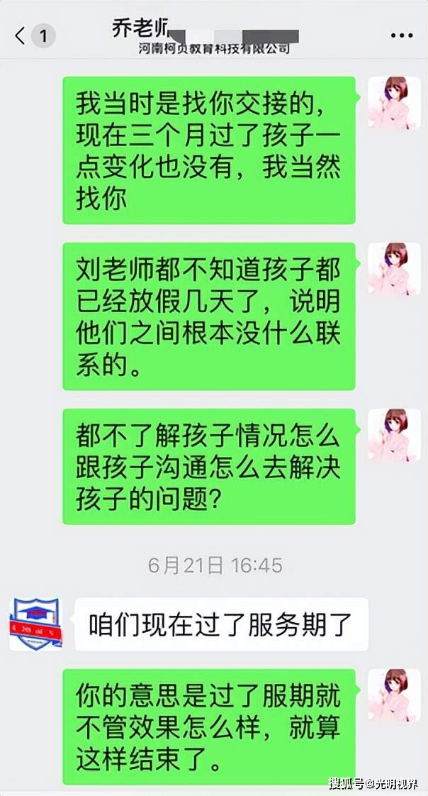 由于缴费的都是“问题孩子”,家长们救子心切,考虑不周。“柯贞教育售前客服说的天花乱坠诱导我们消费,交费并签订合同,但交钱后却跟说的服务不同。”一家长说,孩子青春期求助,发现该机构老师水平差且参差不齐,缴费前承诺涉及到家长和孩子之间的教育,缴费后从不主动过问,都是家长一次次找他们让他们给孩子沟通,和孩子的沟通少之又少,完全没有效果,强烈要求退费不处理。