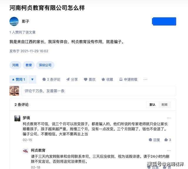 2021年11月,网名影子在网上投诉称:“柯贞教育”不可信,说三个月可以改变孩子,都是骗人的,他们所说的专家老师就只会让家长顺着孩子,孩子越来越严重,拖慢三个月,没有一点改变。三个月到期了,钱也不会退了。骗子公司,不要相信。这位来自江西的家长还劝大家,不要再去上当。