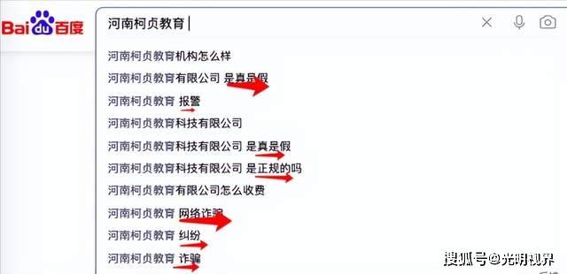 通过搜索河南“柯贞教育”关键词发现,搜索框立即弹出关于该公司诈骗、纠纷、真假等相关内容,公司问题可见一斑。