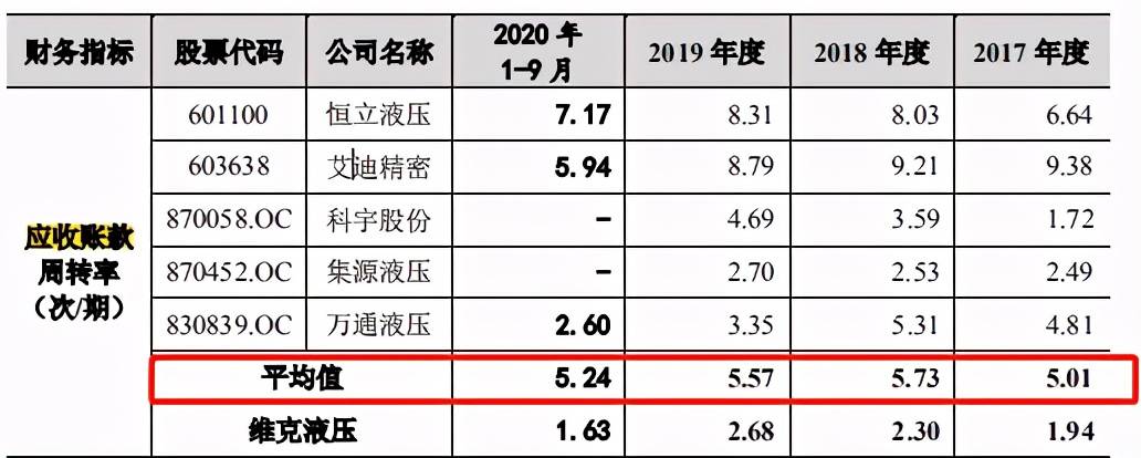 此外,维克液压应收账款周转率在报告期内分别为1.94次、2.30次、2.68次和51.93次,低于同行业平均值5.01次、5.73次、5.57次和5.24次。应收账款周转率下滑,或给公司带来一定的资金风险。
