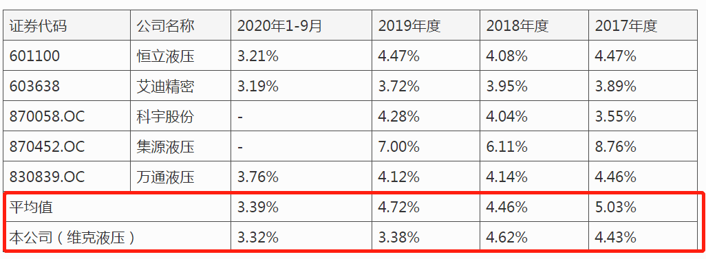 招股书中显示,2017年至2020年1-9月份,公司研发费用分别为659.53万元、960.23万元、1049.74万元和766.16万元,研发费用占营业收入的比例分别为4.43%、4.62%、3.38%和3.32%,而同行业可比上市公司研发费用率均值分别为5.03%、4.46%、4.72%、3.39%。,维克液压的研发费用率略低于同行。