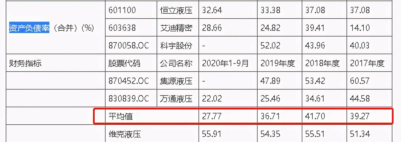 据招股书中披露,2017-2020年1-9月,维克液压公司资产负债率分别为51.34%、55.51%、54.35%、55.91%,而同行业可比公司平均值分别为39.27%、41.70%、36.71%、27.77%,经对比发现,整体上,维克液压公司资产负债率竟超出同行业近二十个百分点。
