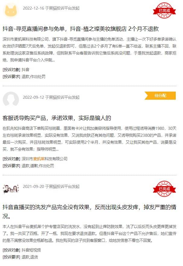 网友一投诉麦凯莱:旗下抖音-寻觅直播间参与主播的免单活动,主播让一次下好多单承诺确认收货好评晒图7天后免单,发起仅退款即可,但是过去2个多月了有6单一直不给返,联系主播不回,联系助理说这家店售后系统故障,但我联系平台客服告诉我它售后系统没问题,于是我发起退款,商家拒绝,我申请抖音平台介入仲裁,最终结果支持我,发起了商家退款,结果退款失败,显示商家在平台的储存资金余额不足,款也没退成,抖音平台就不处理了,任由门店客服说资金被冻结了,但这家公司的主播还开了几个新号还有钱入账资金没有冻结,骗人,今天我又联系客服,告诉我没有冻结,让我一直等着,也不说什么时候处理,怀疑老板要跑路,客服心知肚明故意拖延时间。
