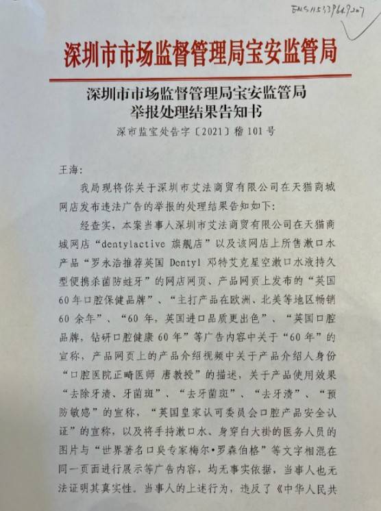 王海的举报回复显示,“dentylactive 旗舰店”以及该网店上所售漱口水产品“罗永浩推荐英国 Dentyl 登特艾克星空漱口水”宣传“英国60年口腔保健品牌”、“主打产品在欧洲、北美地区畅销60余年”、“60年,英国进口品质更出色”、“口腔医院正畸医师黄教授,使用效果去除牙渍牙菌斑、预防敏感”医务人员形象即世界著名口臭专家梅尔.罗森博格等广告内容无事实根据,当事人无法证明真实性,违反《广告法》第四条、第二十八条,罚款20万元。