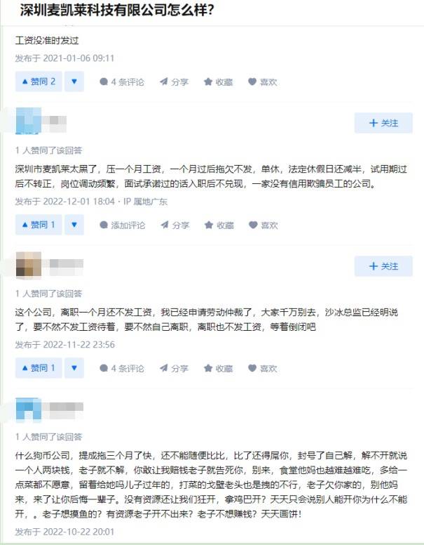 在知乎平台,多个网友评论“深圳麦凯莱科技有限公司怎么样?”时称,“深圳市麦凯莱太黑了,压一个月工资,一个月过后拖欠不发”、“离职一个月还不发工资”、“提成拖三个月了快”。