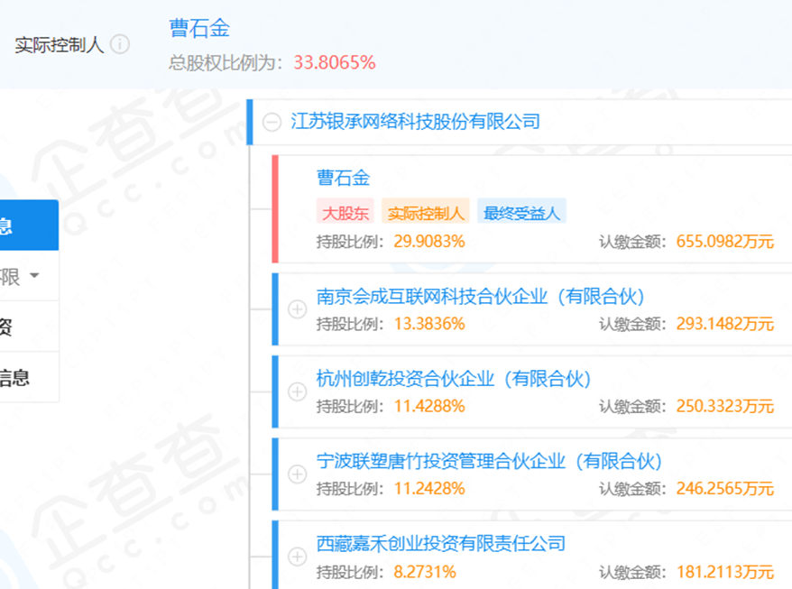 企查查显示,江苏银承网络科技股份有限公司注册资本与实缴资本均为2190.3581万元,法定代表人为公司创始人曹石金,后者持有公司33.8065%股份。