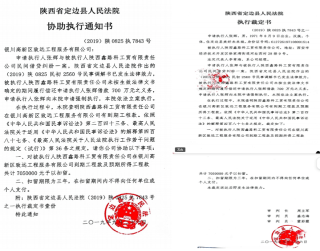 2019年9月底,就在致远公司准备给武先生的西航电力进行工程结算的时候,就在此时,定边县法院执行局工作人员突然来到庆阳市环县找到致远公司,送达定边县人民法院文书“回证”,要求对鑫路科公司在致远公司的到期工程款及预期所得工程款共计7050000元予以扣留。依据是定边县人民法院于2019年9月26日分别作出的(2019)陕0825执7843号《协助执行通知书》、(2019)陕0825执7843号之一《执行裁定书》及(2019)陕0825执7843号之二《履行通知书》。