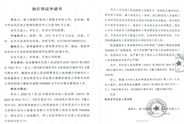 收到定边县人民法院执行裁定书的致远公司于2020年8月4日向定边县人民法院提交《证明材料》及《执行异议申请书》称:“致远公司查阅历年的业务合同及往来账目,找不到任何与鑫路科公司的业务文件和账目,致远公司从未与其有过业务往来,不存在过任何工程施工合作,也没有任何财务往来”。据此要求依法撤销定边县人民法院作出的(2019)陕0825执7843号之一及之二的《执行裁定书》、《协助执行通知书》、《履行通知书》,撤销定边县人民法院要致远公司协助履行将被执行人鑫路科公司在致远公司的到期工程款及逾期7050000元予以扣留及提取的义务。并对鑫路科公司及李某海的干扰行为予以严惩。