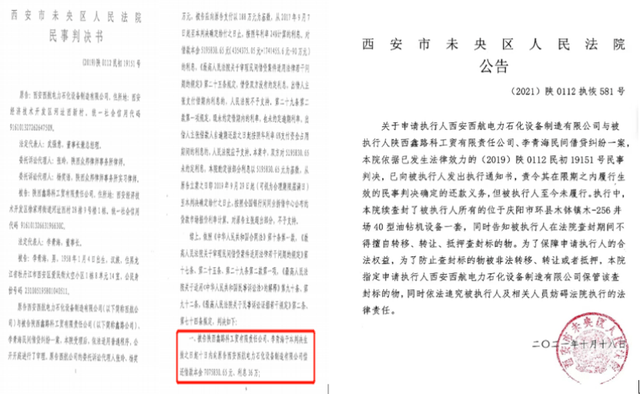 2021年10月18日,西安市未央区人民法院发布 [(2021)陕0112执恢581号] 公告,对鑫路科公司及李某海位于庆阳市环县木钵镇-256井场40型油钻机设备进行续查封。