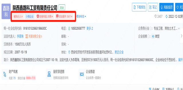记者调查发现,陕西鑫路科工贸有限责任公司(以下简称鑫路科公司)成立于2007年10月19日,注册资本1500万元人民币,实缴资本500万元,法定代表人李某海。该公司自身风险20条,关联风险23条,历史风险41条,司法案件36个。2022年被执行人信息3条,累计被执行总金额405.4022万元,历史被执行人信息34条,累计被执行总金额达2477.4604万元。李某海本人自身风险共有22条,其中共有17条因“关联企业未履行法定义务”及“自身未履行法定义务”被限制高消费。