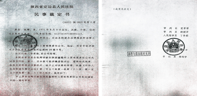 在武先生及律师团队的共同努力下,2021年9月2日定边法院作出民事裁定书 [(2021)陕0825民再9号]称本案可能涉嫌虚假诉讼,需将相关线索,和有关材料移送侦查机关,故中止原告张某诉鑫路科公司的民间借贷纠纷一案的审理。