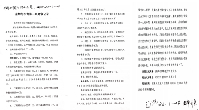 在2022年1月24日在定边县人民法院召开的“张某与李某海一案庭审记录”中,在没有武先生的西航公司参与诉讼的前提下,原告、被告“愉快”的坐到了一起。记者发现原告张某的700万借据竟然“化整为零”,变成了张某、钟某增等八人的债权转到原告张某处,其中326万元为本金,利息3933216元,原告竟然还让了18万,凑整700万。当然这些不出意外的,被告一律予以承认。