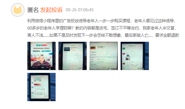 此外,还有消费者投诉企牛商学院利用微信小程序里的广告投放诱导老年人一步一步购买课程进行消费。