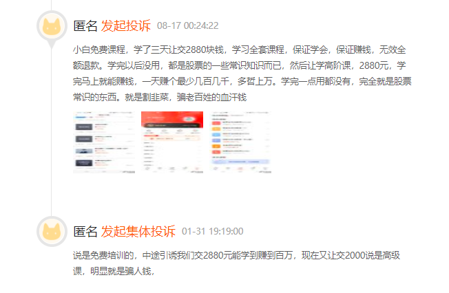 另一用户表示,平台称免费课程,但是学了三天同样已让缴纳2880块钱学习全套课程,并保证学会、保证赚钱、无效全额退款。自己学完后平台让学高阶课,学完后感觉一点用处都没有,完全就是股票常识的东西。
