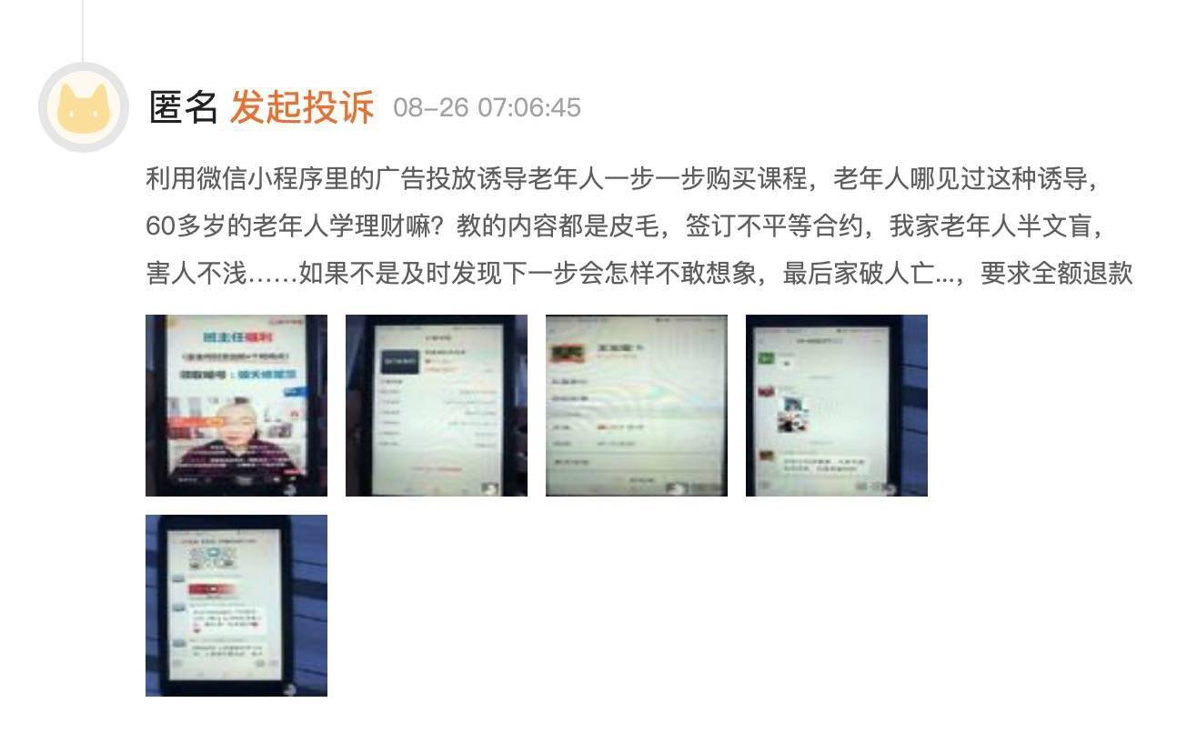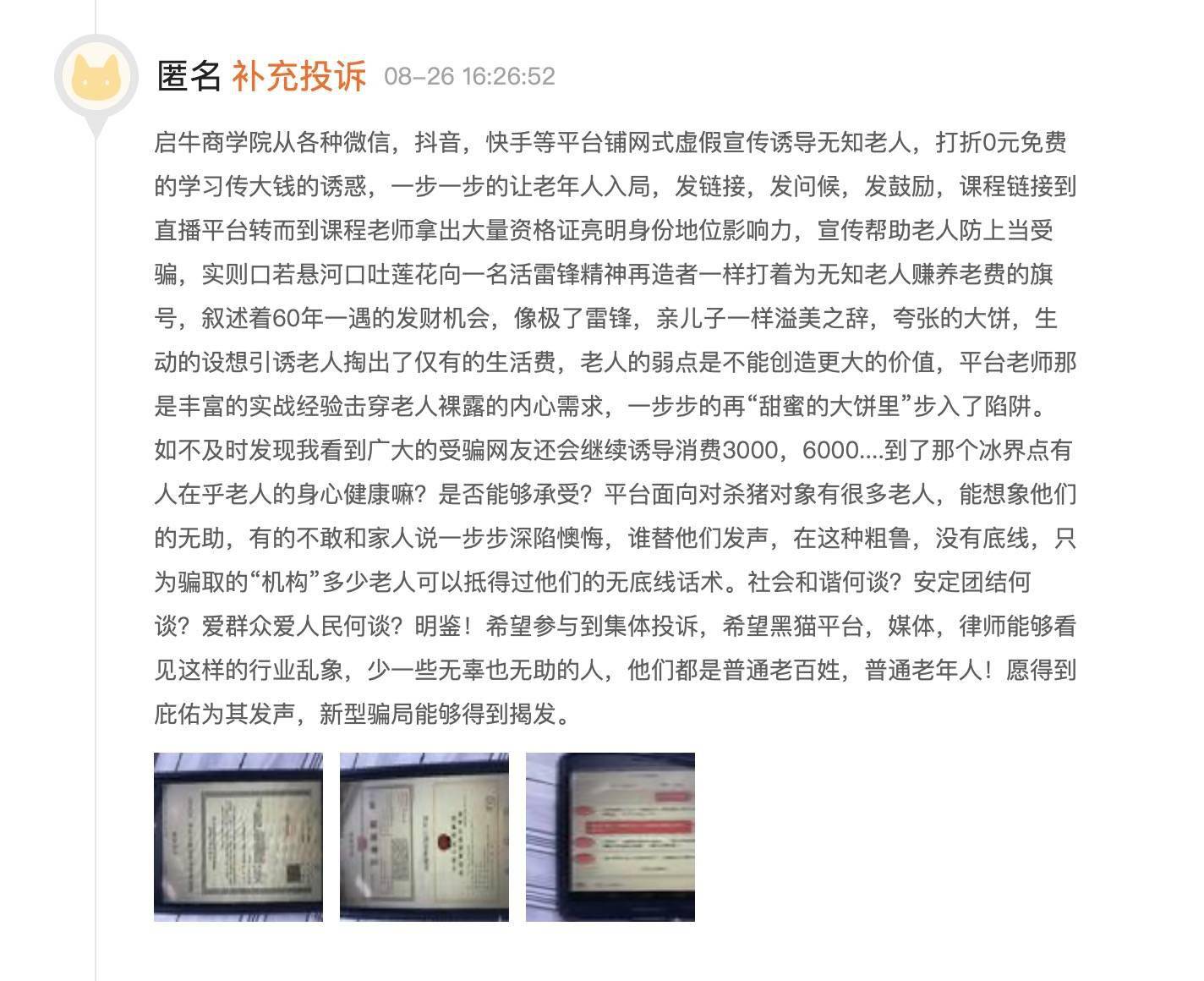 用户表示,启牛商学院通过各种社交媒体平台,采用“铺网式”虚假宣传,诱导不知情的老人,一步步入局,通过发链接、问候、鼓励等手段,以“为无知老人赚养老费”的说辞,抓住老人的弱点,欺骗老人掏出仅有的生活费。