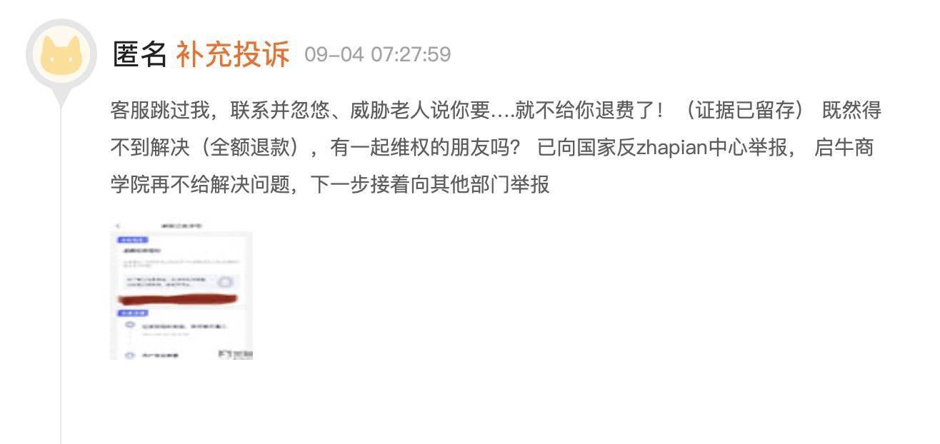 消费者投诉启牛商学院存虚假宣传行为 威胁用户不予退费