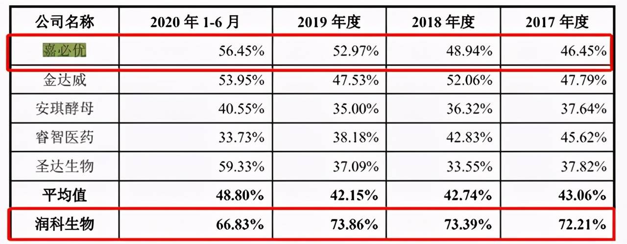 招股书显示,2017-2020年上半年,润科生物的毛利率分别为72.21%、73.39%、73.86%、66.83%。整体上来看,润科生物近年来毛利率也基本维持在70.00%左右。而同期同行业可比上市公司的综合毛利率均值分别为43.06%、42.74%、42.15%和48.80%,润科生物的毛利率高于同行近三十个百分点。