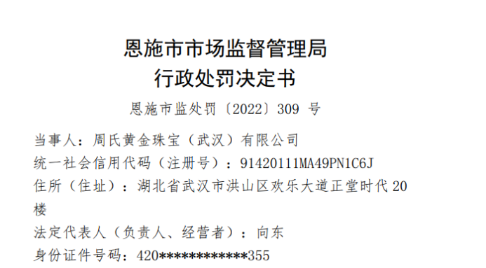 行政处罚信息显示,2021年9月11日,恩施市市场监督管理局接恩施市人民政府交办指令:周氏金满满珠宝(恩施州)有限公司推广“金满满”APP 线上销售黄金,并对外宣称“买黄金、送黄金、赚黄金”、“购买10000g 黄金,得 90000g 黄金,额外赚3.6亿”,该经营活动存在重大金融风险,要求该局核查处置。