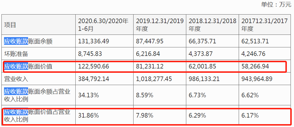 2017-2020年上半年,公司应收账款账面价值分别为5.8亿元、6.2亿元、8.12亿元和12.26亿元,占营业收入的比例分别为6.17%、6.29%、7.98%和31.86%,2020年应收账款占比激增。