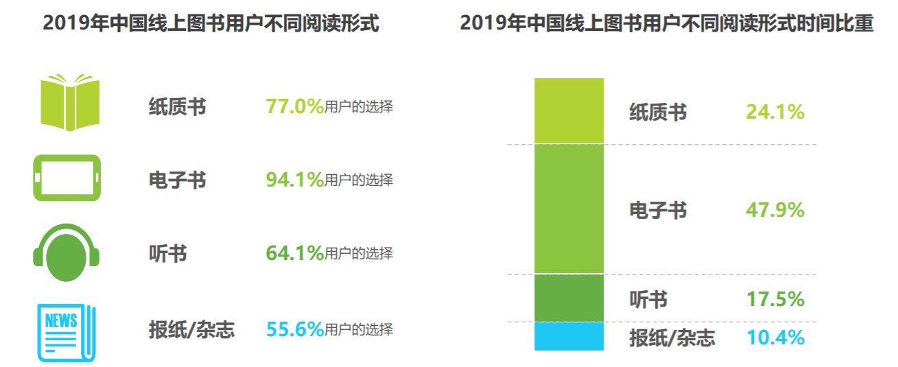 其中,电子阅读成为了94.1%的选择,而纸质书只有77%的用户进行了选择。此外,近年来以听书为代表的新型阅读方式也成为了不少用户的新选择。