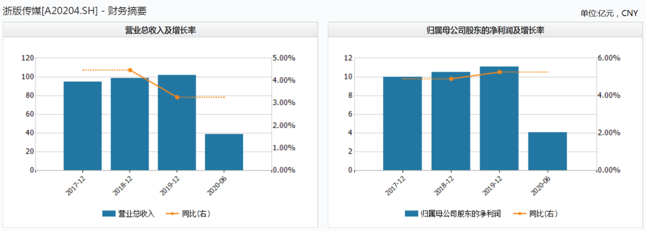 据招股书披露,2017-2020年上半年,浙版传媒的营业收入分别为94.40亿元、98.61亿元、101.83亿元和38.48亿元,2018年和2019年的营业收入同比增长率分别为4.47%和3.26%;同期归母净利润分别为9.99亿元、10.48亿元、11.03亿元和4.09亿元,2018年和2019年的同比增长率分别为4.90%和5.25%。