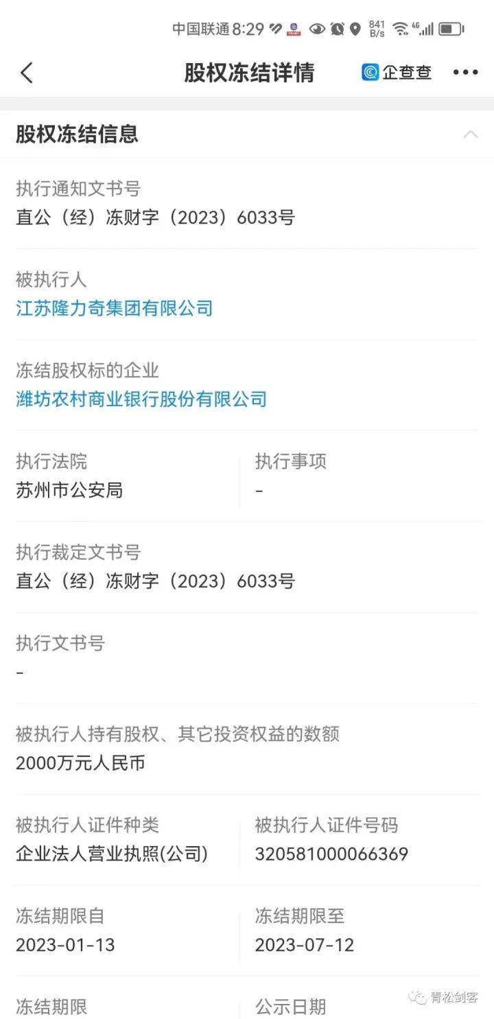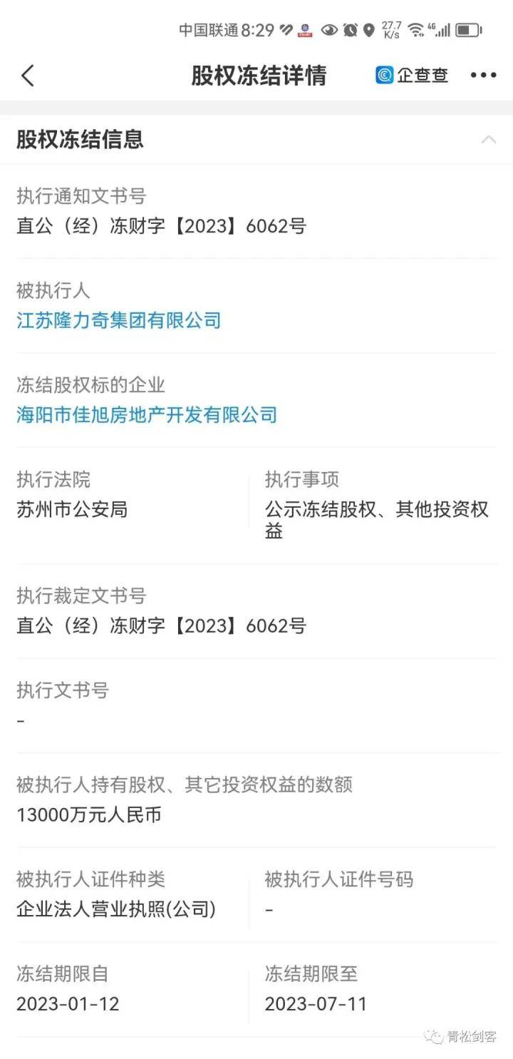 具企查查相关信息显示苏州市公安局依据直公(经)冻财字{2023}6062号,6033号。分别冻结隆力奇集团在海阳市佳旭房地产开发有限公司股权13000万冻结时间为半年。冻结潍坊农村商业银行股份有限公司股权2000万冻结时间为半年。