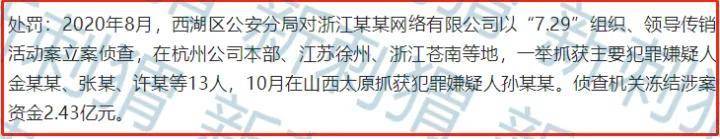 2020年8月,西湖区公安分局对浙江某某网络有限公司以“7.29”组织、领导传销活动案立案侦查,在杭州公司本部、江苏徐州、浙江苍南等地,一举抓获主要犯罪嫌疑人金某某、张某、许某等13人,10月在山西太原抓获犯罪嫌疑人孙某某。侦查机关冻结涉案资金2.43亿元。