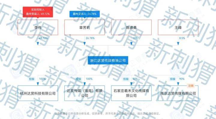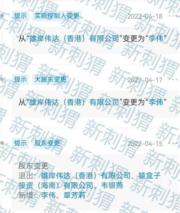 2022年4月15日,达赏传媒发生股东变更:雄岸伟达(香港)有限公司、猿盒子投资(海南)有限公司、韦银燕退出,李伟成为达赏传媒大股东及实际控制人。